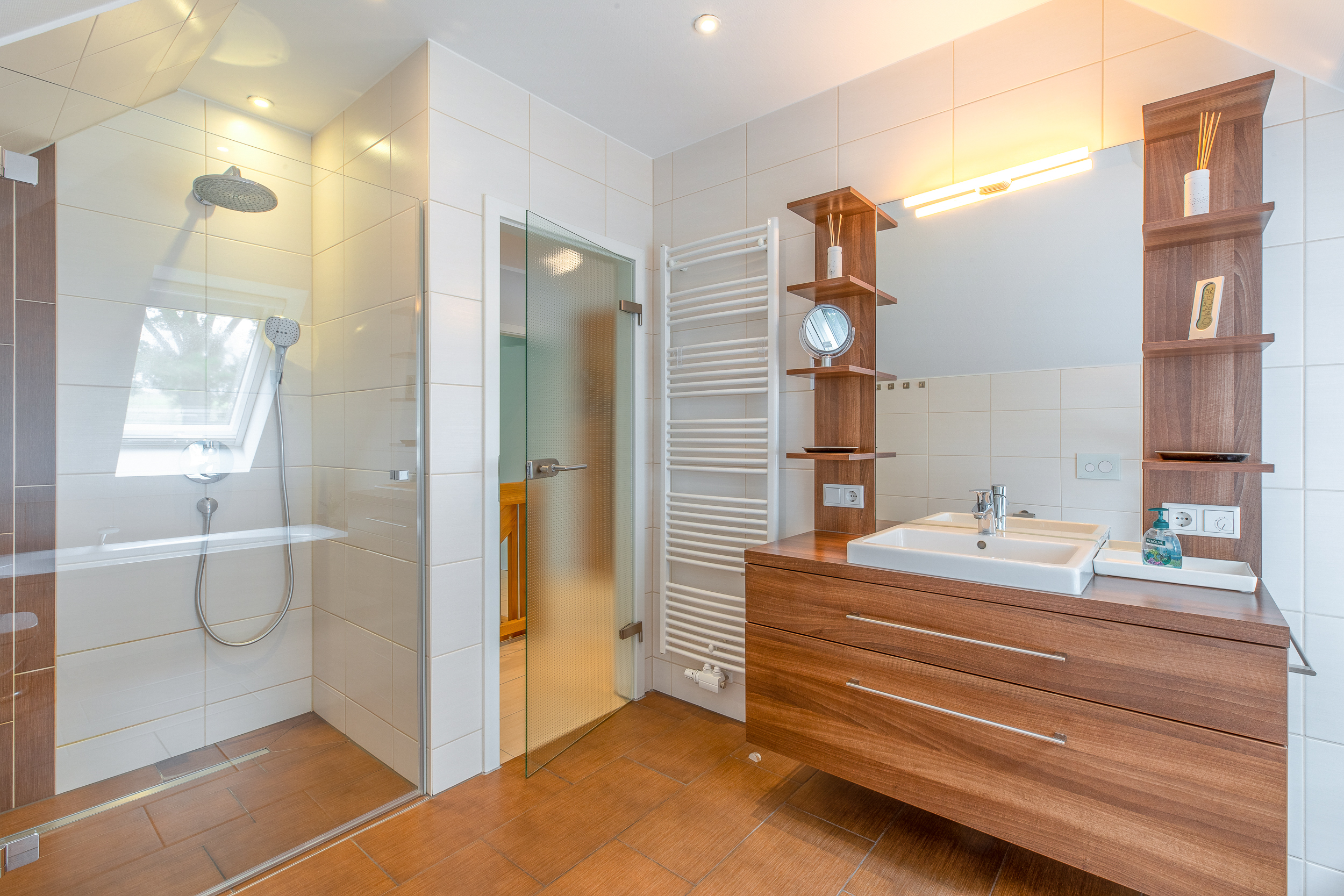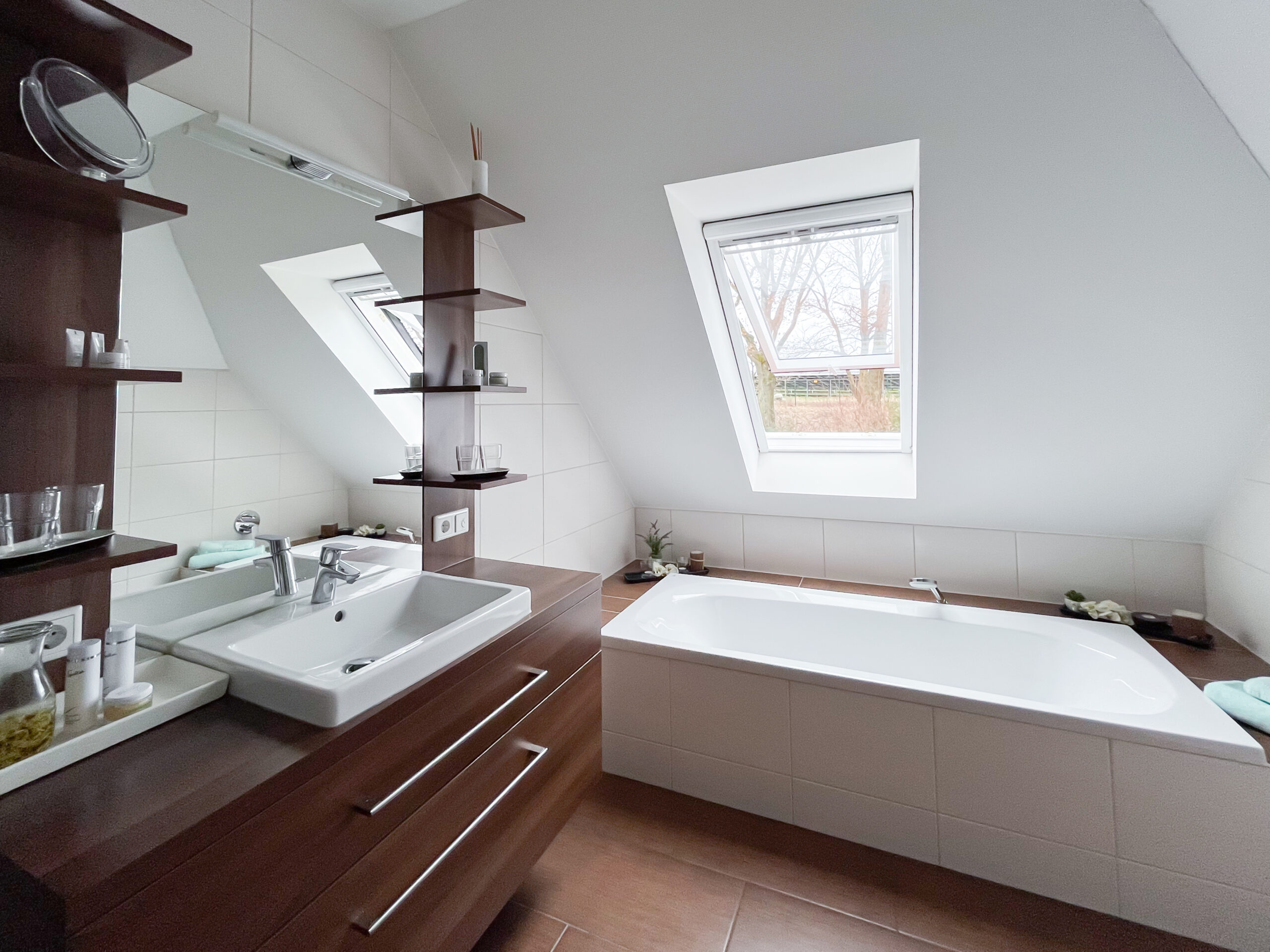 - Zwei zur Entspannung einladende Badezimmer mit ebenerdiger Regendusche und einer großen Badewanne